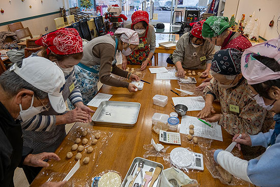 あんこを薄皮で包む秘訣などおそわりながら、丸くて優しい味わいの黒糖饅頭が